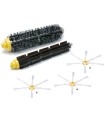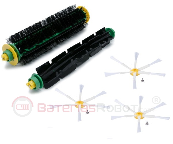 Cepillo de cerdas fabricado en poliamida + cepillo flexible + 3 cepillos laterales de 6 aspas. Más resistencia a la abrasión que los cepillos originales. 100% compatible con todos los modelos de Roomba 500.